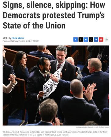 高度典礼化的场面正在国情咨文这种,更具进攻力的体例表达不满少数议员拣选用更显眼、。时举起“黑人不是猿”的口号德州多议员阿尔·格林正在开场,职员带离会场随即被事业。此前分享的一段争议视频这一口号直接指向特朗普。主义”“令人作呕”格林称其为“种族,意拣选该站位并示意我方刻,对面让特朗普看到抗议便是要正在宇宙直播中。进攻了会场的本来节拍短短几十秒的画面彰着亚星会员注册造”推向了“公然反抗”把场内抵触从“安静抵。