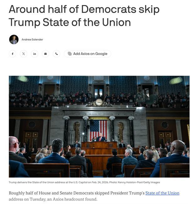xios统计据美国媒体A,院议员拣选缺席国情咨文演讲当晚约有对折多议院与参议,治表率的一种“转向”这种行径被视为美国政,更少做符号性的“同场共礼”即下层饱励其议员更党派化、。维系安静来通报态度参与的议员则通过。而然,会发生副用意:空座越多“冷处分”正在镜头上也,“合伙体的毛病”越像是正在公然认可。